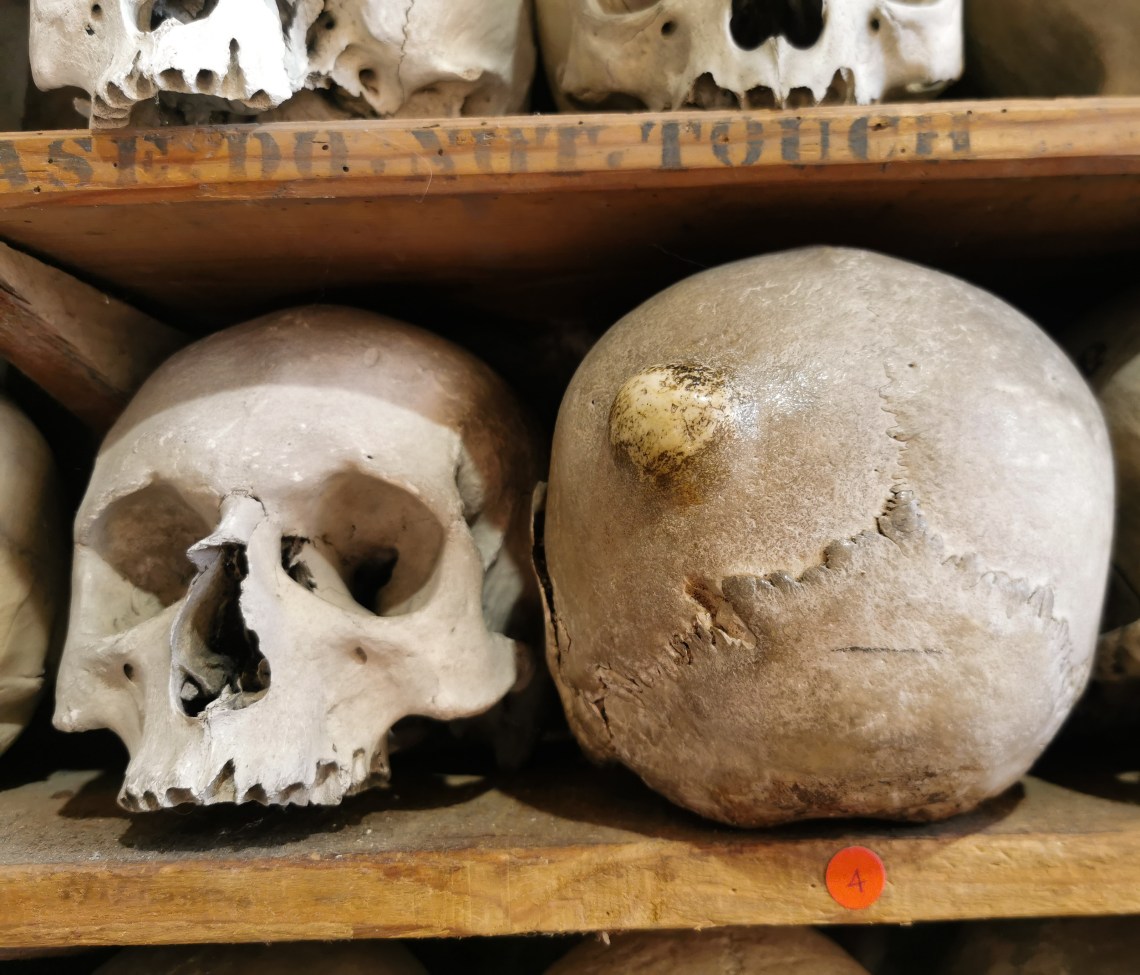 There are 1022 skulls held here which are thought to be mostly European. With quite a few of the skulls you can see the likely cause of the person’s death. Some more clearer than others, as you can see below.